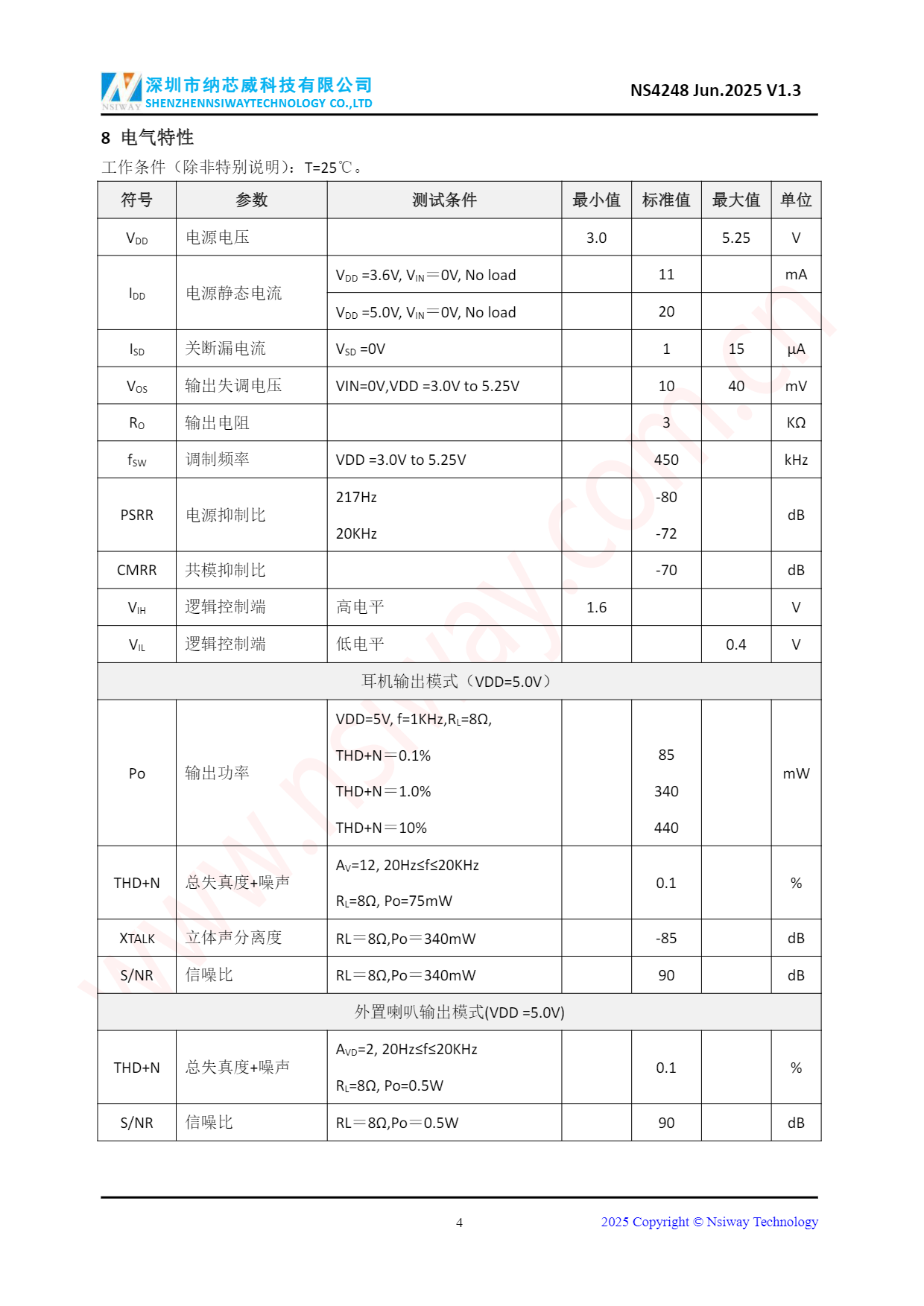 NS4248 3.0W×2 雙聲道 D 類音頻功率放大器附加立體聲耳機功能
