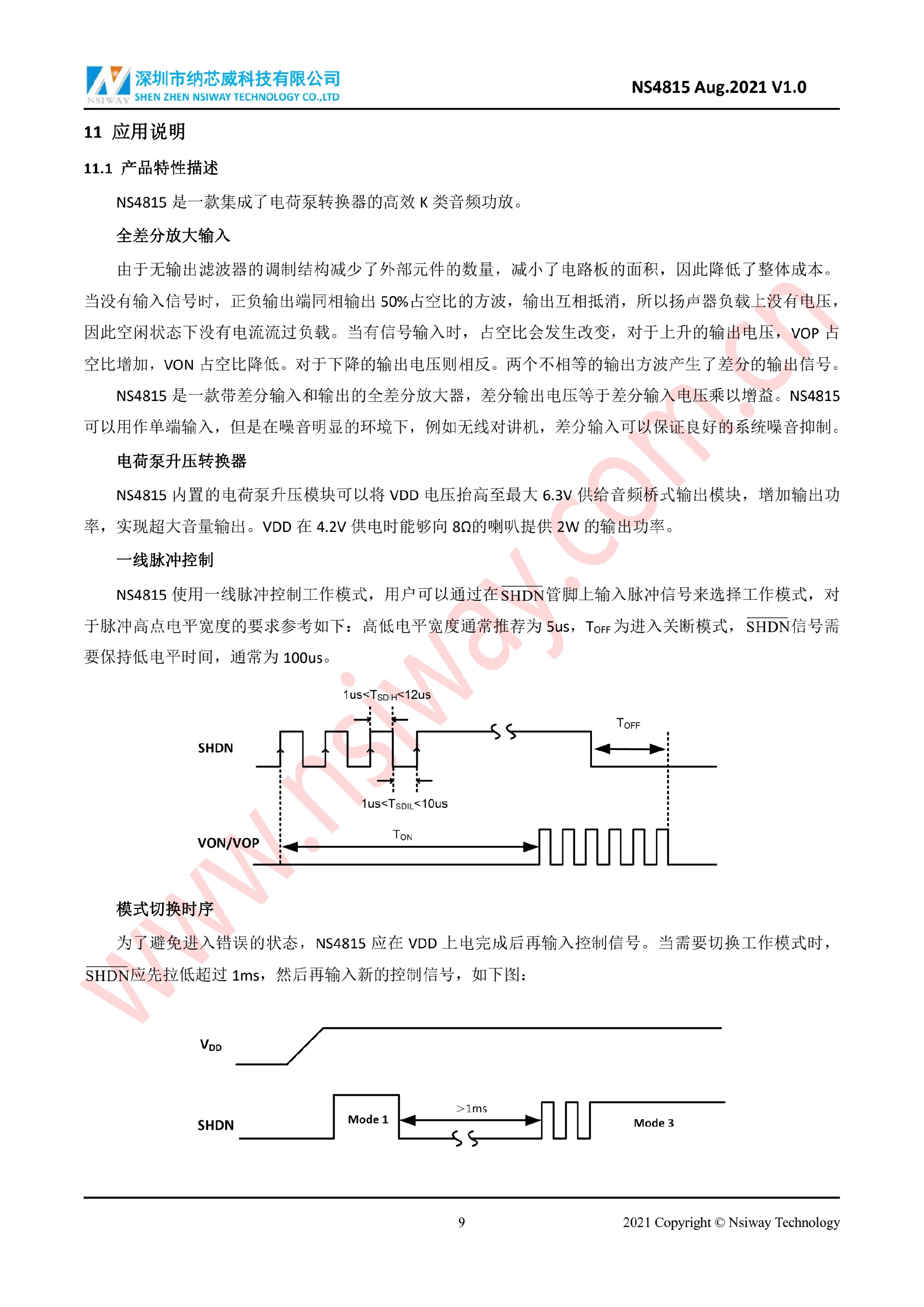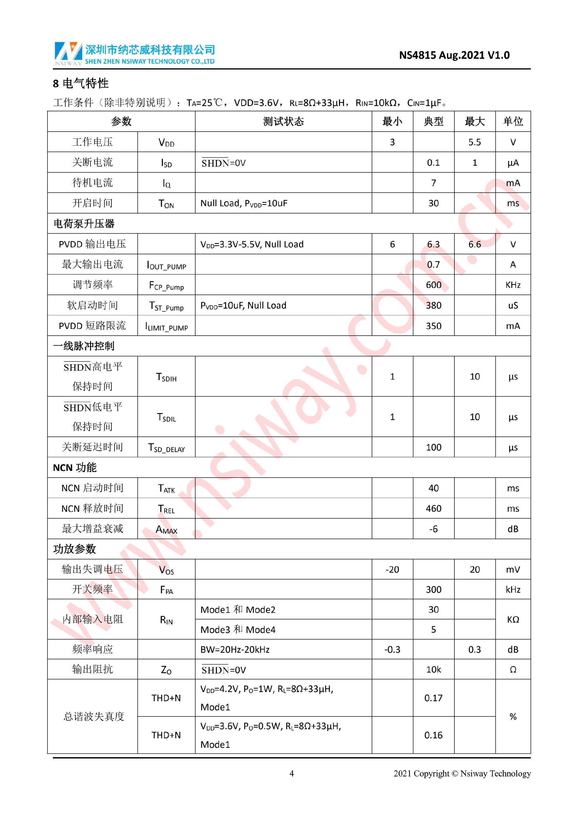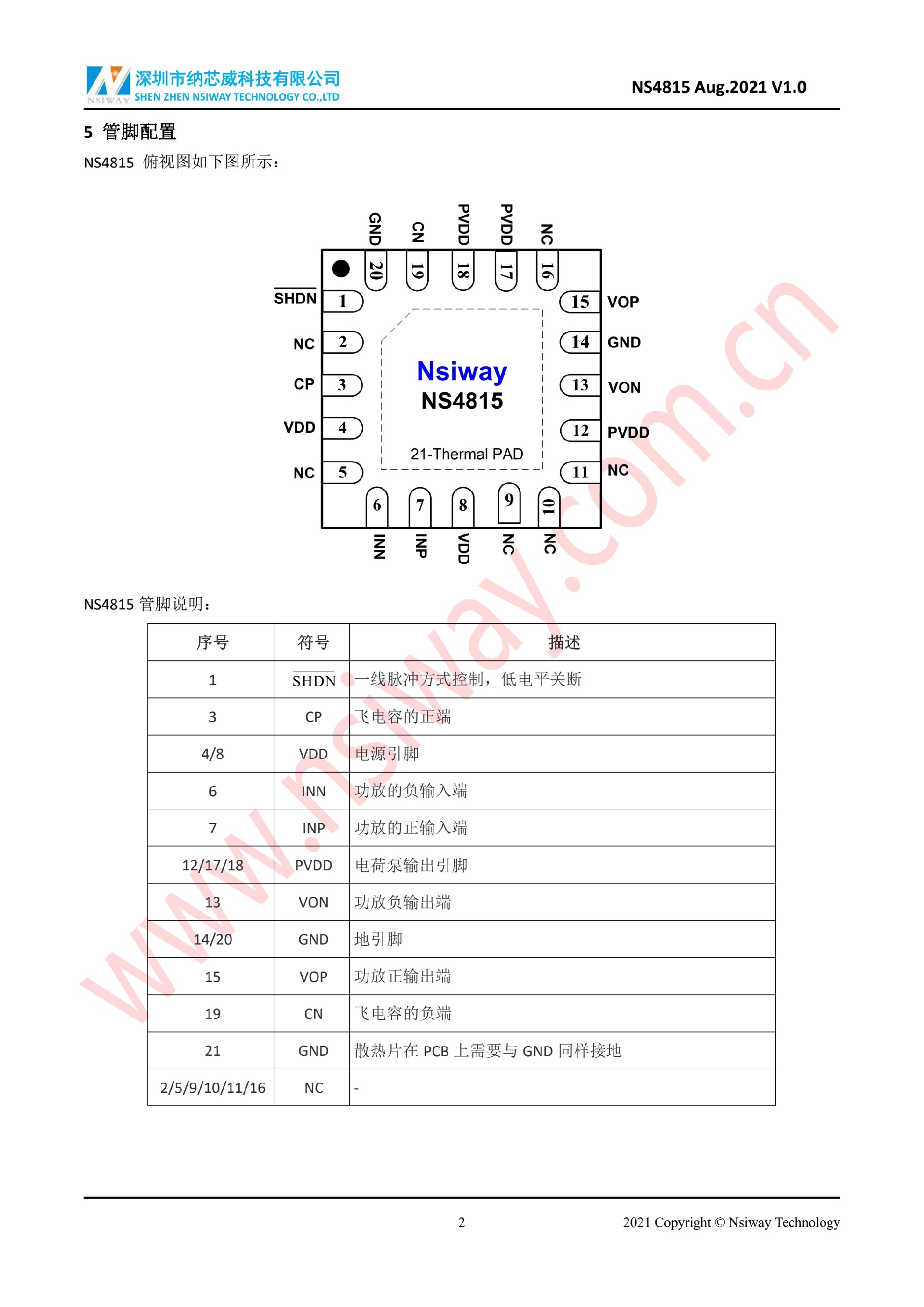 NS4815 2W 輸出功率 K 類音頻功率放大器